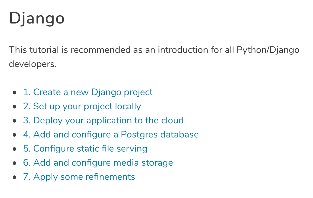 尤其是看 Django 的教程. 教程做出的承诺是: 如果你有学习教程的基本知识, 并按照它的指示进行操作, 你将获得一个可以工作的 Django Web 应用程序, 包括 Postgres 数据库, S3 媒体存储等等. 作为教程, 它必须实现这一承诺.